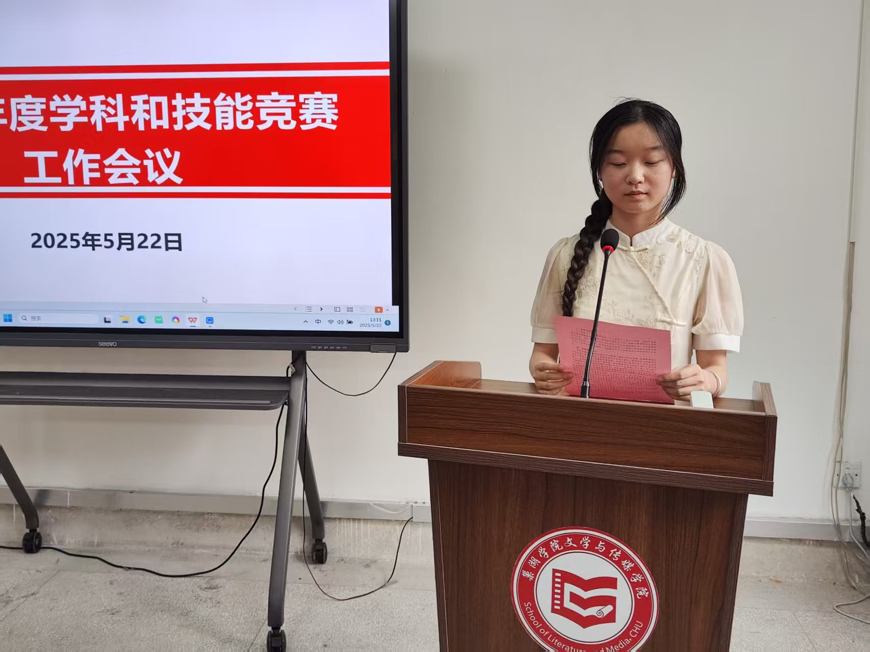 为总结2024年度学科和技能竞赛经验,推进2025年学科和技能竞赛工作,5月22日中午文学与传媒学院在敏行楼会议室召开了2025年学科和技能竞赛工作会议。院领导班子、各基层教学组织负责人、各专项赛事负责人、各年级赛长及部分获奖同学代表参加了此次会议,会议由学院团委书记程生风主持。