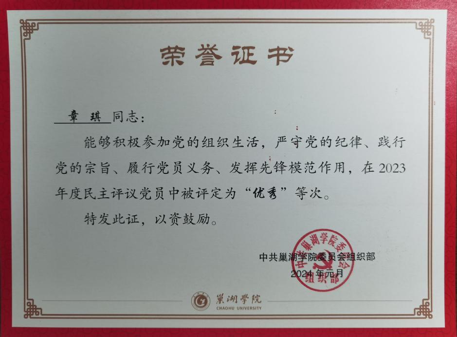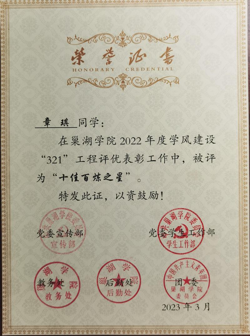 章琪十分重视积累进步和脚踏实地的重要性。“还记得自己刚开学时需要在班级作自我介绍,我提前在宿舍背了一下午,最后也只是很一般还略带僵硬地完成。但我很开心,不管别人表现多么好,自己是进步了。”对于每一次进步,章琪都会感到很开心,她时常庆幸自己还在大学,拥有较低的试错成本,可以去尝试、被包容,为此她极为珍惜每一次表现的机会,总是积极探索尝试新事物,不断挑战自己,实现自我超越。“大学是积累知识和锻炼能力的关键时期。我从不满足于课堂上的学习,而是积极参与各类实践活动和加入学生社团组织。我参加了第十届‘挑战杯’安徽省大学生课外学术科技竞赛,从大一暑假到大三暑假,我沉淀了三年。在这三年,我与团队成员一起探讨问题、设计方案,即使面临困难和挑战,我也从不退缩。同时,我还利用课余时间参加志愿服务活动,深入社区,为居民提供实际帮助。”章琪的脚踏实地不仅让她在学习上取得了优异成绩,也让她在实践中锻炼提升了自我,为将来走向社会、适应工作打下坚实的基础。