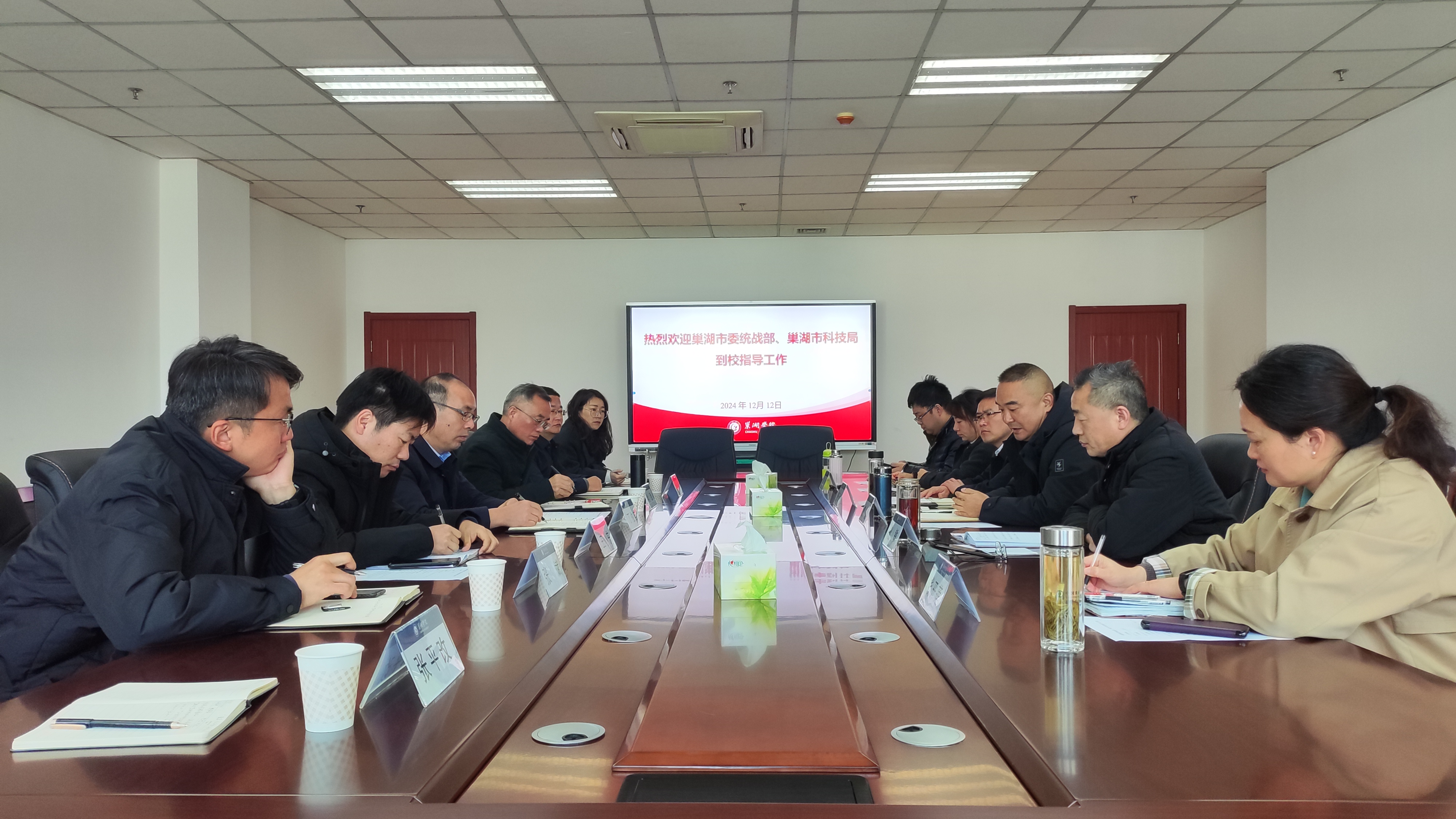 为进一步深化校地合作,构建校地联合、优势互补、互惠双赢的发展新格局。12月12日上午,巢湖市委统战部副部长曹勇,巢湖市科技局局长魏敏、副局长钱开莲,巢湖市科创集团董事长项云生等一行来校开展合作交流。校党委委员、副校长丁俊苗,科研处处长姚磊,化学与材料工程学院院长王小东,生物与环境工程学院副院长陈小举及相关教师参加交流会。会议由姚磊主持。