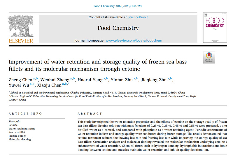 近日,安徽省环巢湖乡村振兴协同技术服务中心(培育)研究人员陈政在微生物发酵产品—四氢嘧啶作为新型保水剂应用于水产品加工贮藏中的研究方面取得新进展,相关成果以“Improvement of water retention and storage quality of frozen sea bass fillets and its molecular mechanism through ectoine”为题发表在国际权威期刊《Food Chemistry》(中科院一区期刊,IF:8.5)。